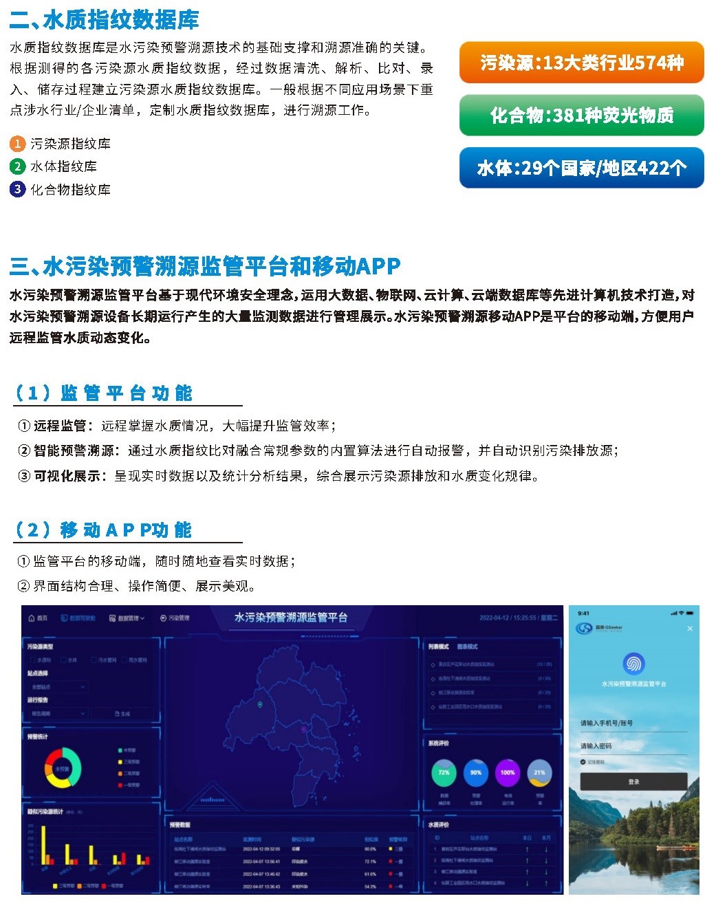 國(guó)內(nèi)外首創(chuàng)的水質(zhì)指紋污染溯源技術(shù)核心產(chǎn)品包括系列水污染預(yù)警溯源儀、水質(zhì)指紋數(shù)據(jù)庫(kù)、水污染預(yù)警溯源監(jiān)管平臺(tái)。利用系列水污染預(yù)警溯源儀進(jìn)行水質(zhì)指紋測(cè)定,應(yīng)用高速智能數(shù)據(jù)分析運(yùn)算軟件進(jìn)行指紋數(shù)據(jù)分析,通過(guò)與水質(zhì)指紋數(shù)據(jù)庫(kù)進(jìn)行指紋比對(duì),快速鎖定污染排放源。