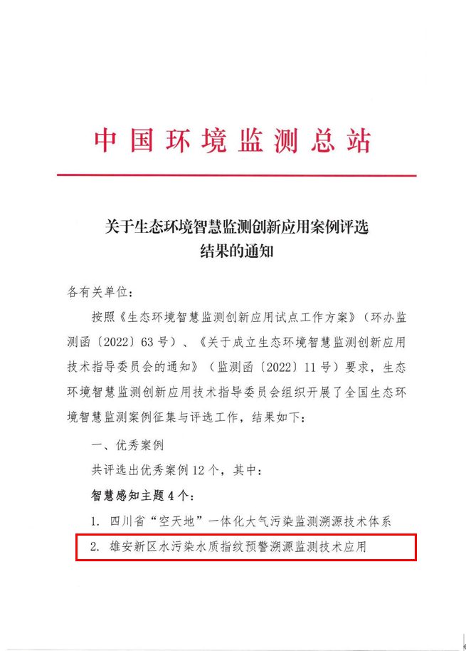 | 喜報(bào)!《雄安新區(qū)水污染水質(zhì)指紋溯源監(jiān)測技術(shù)應(yīng)用》入選生態(tài)環(huán)境智慧監(jiān)測創(chuàng)新應(yīng)用案例 |
