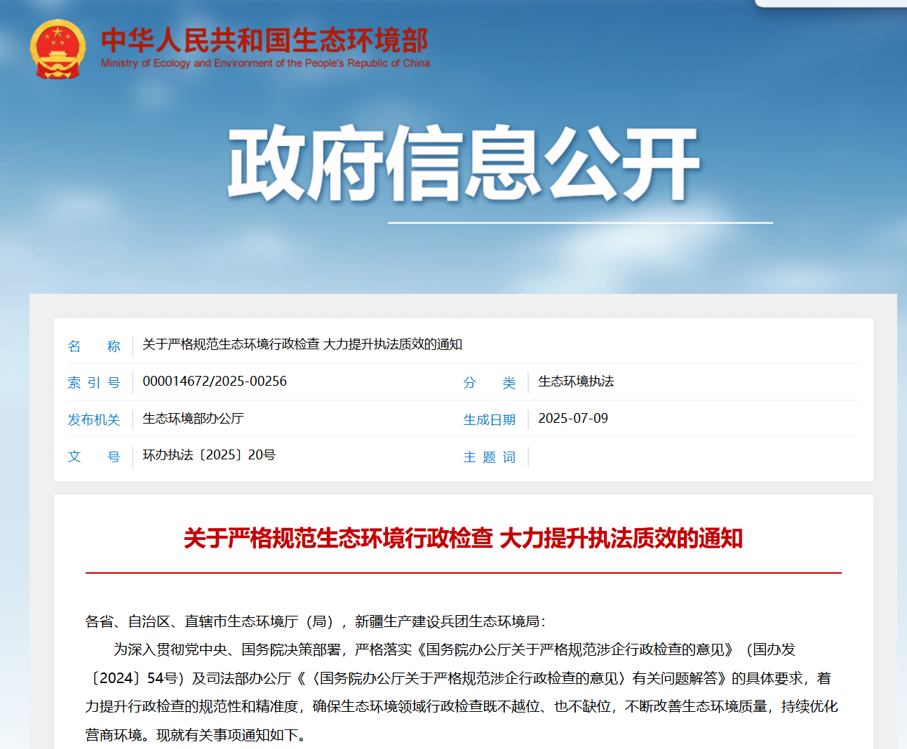 近日,生態(tài)環(huán)境部印發(fā)《關(guān)于嚴(yán)格規(guī)范生態(tài)環(huán)境行政檢查 大力提升執(zhí)法質(zhì)效的通知》(環(huán)辦執(zhí)法〔2025〕20號(hào)),就生態(tài)環(huán)境領(lǐng)域行政檢查工作作出全面規(guī)范。
